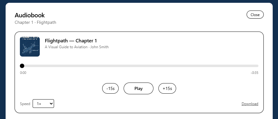 A moment after the QR code is scanned the user is met with a book that opens its cover (the same as the physical book cover) and reviles an audio player where the user can listen to the audio book. Test it your self HERE.