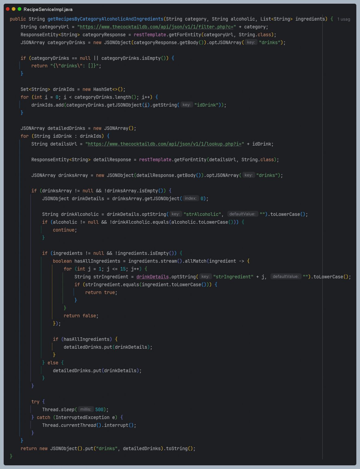 Mit dem neuen, optimierten Ansatz werden die Rezeptdaten nun beim Start der Anwendung automatisch aus der API geladen und in die lokale Datenbank geschrieben. Die Suche erfolgt anschließend vollständig serverseitig über diese Datenbank, wodurch Abfragen deutlich schneller und stabiler laufen. Gleichzeitig bleibt die Filterlogik flexibel: Nutzer:innen können nach Kategorie, Alkoholgehalt und Zutaten suchen, ohne dass alle Kriterien zwingend gesetzt sein müssen.