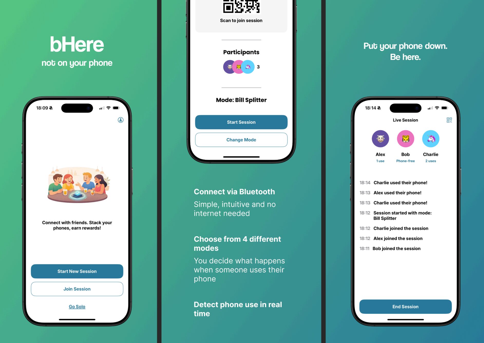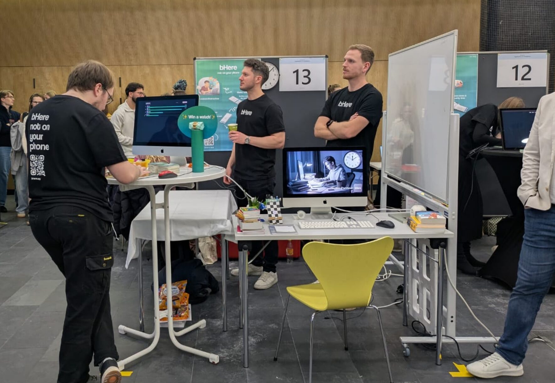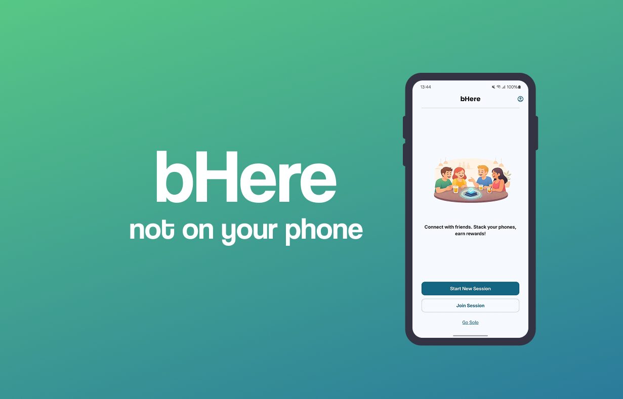 Im 3. Semester des Master-Studiengangs Interactive Technologies (Masterklasse Mobile) stand das große Semestergruppenprojekt an. Als ganze Masterklasse (insgesamt 8 Personen) entwickelten wir über das ganze Semester hinweg bHere, eine soziale App, die Gruppen durch spielerische Mechaniken und Konsequenzen motiviert, beim gemeinsamen Ausgehen das Handy wegzulegen.