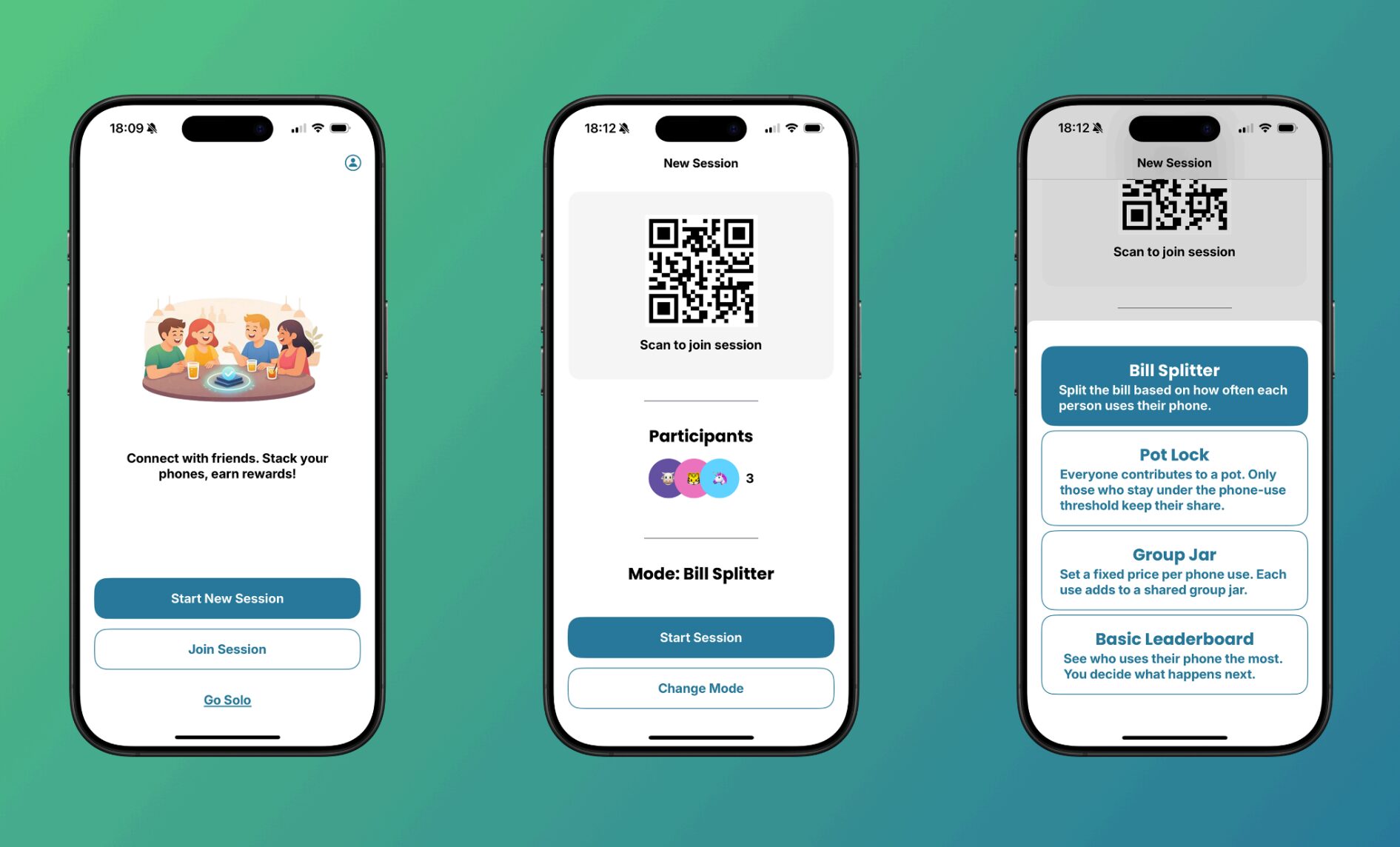 Als “Nice To Have” hatten wir uns primär die Erweiterung um 2 zusätzliche Modi vorgenommen: Beim Modus “Pot Lock” legen die Spieler*innen anfänglich fest, welcher Betrag pro Person in einen virtuellen Topf gegeben werden soll, und ab welcher Handynutzungsgrenze (“Threshold”) man seinen Einsatz verliert. Am Schluss teilen sich die Personen, die den Threshold nicht überschritten haben, den Topf. Beim Modus “Group Jar” legt die Gruppe einen Preis pro Handynutzung fest und am Ende der Session sagt die App, wer wie viel insgesamt in die Gruppenkasse zahlen muss.
