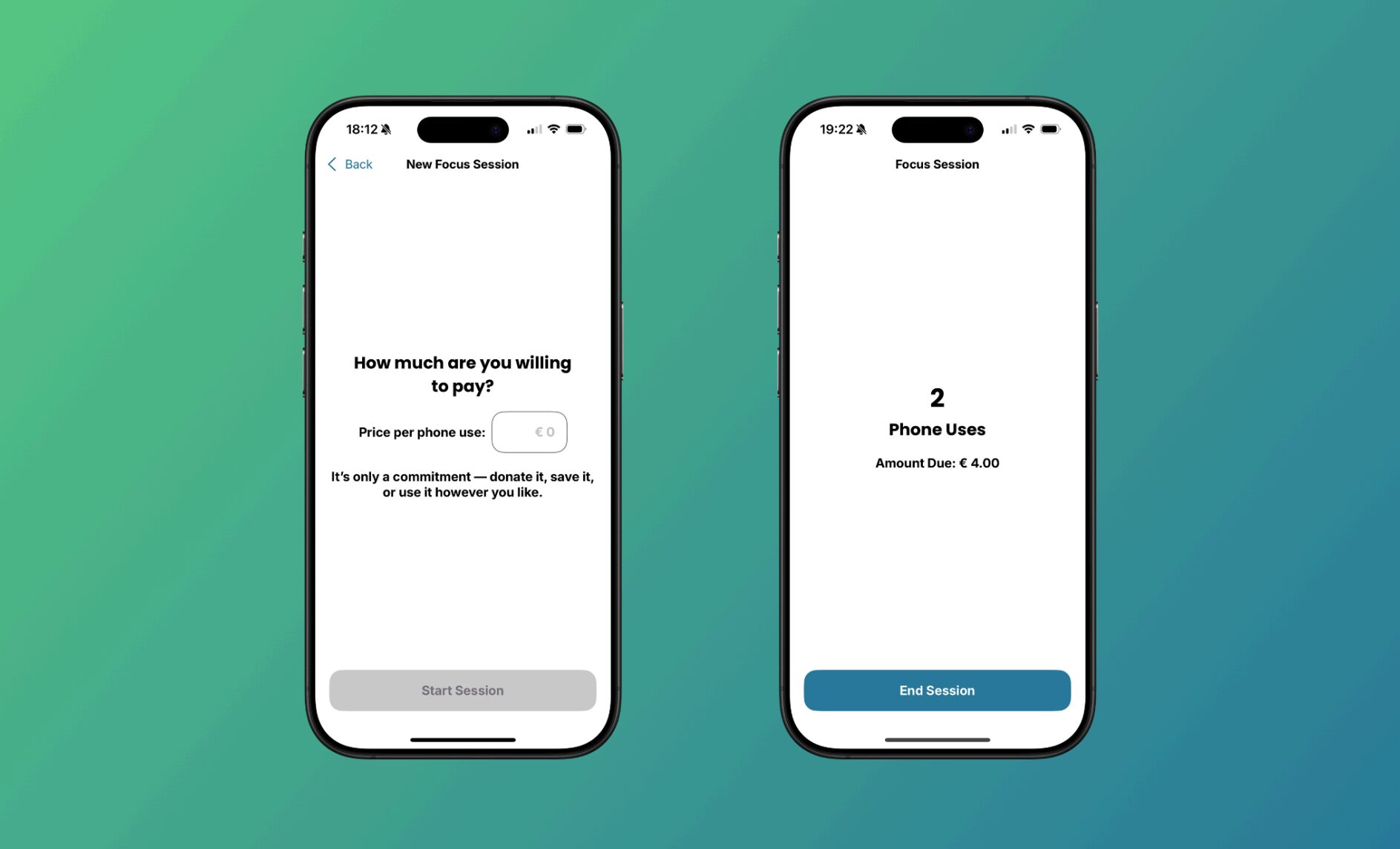 Wie angekündigt, gibt es auch einen Solomodus. Mit dem Klick auf “Go Solo” am Home Screen kommt man zum New Focus Session Screen (links), welcher wie ein Group Jar Modus funktioniert – man muss also den Preis pro Nutzung festlegen. Während der Session (Focus Session Screen, rechts) sieht man die gesamte Nutzungsanzahl und wie viel Geld man sich in das eigene Sparschwein zahlen müssen wird.