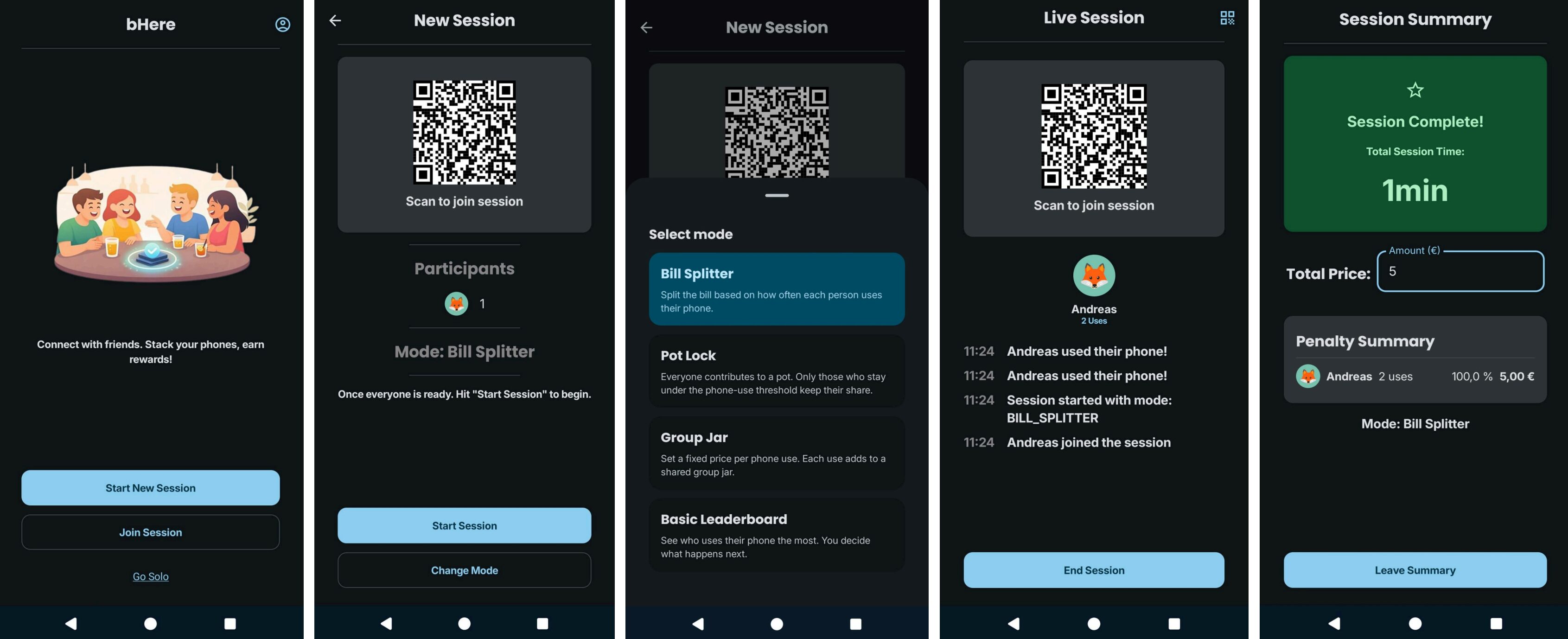 Weiters hatten wir viele coole Ideen, die App durch Features wie Mini Games, einer KI-Funktion zum Rechnung-Scannen (für den Modus “Bill Splitter”), einer History, einem Streak, einer Realtime Abstimmung (für Notfallsituationen, in denen die Handynutzung toleriert wird), einem SSO-Login und einer direkten Zahlung in der App bzw. einer Importfunktion in eine App wie Splitwise oder Tricount zu erweitern, allerdings blieb dafür leider keine Zeit mehr – zumindest in diesem Semester. 😉